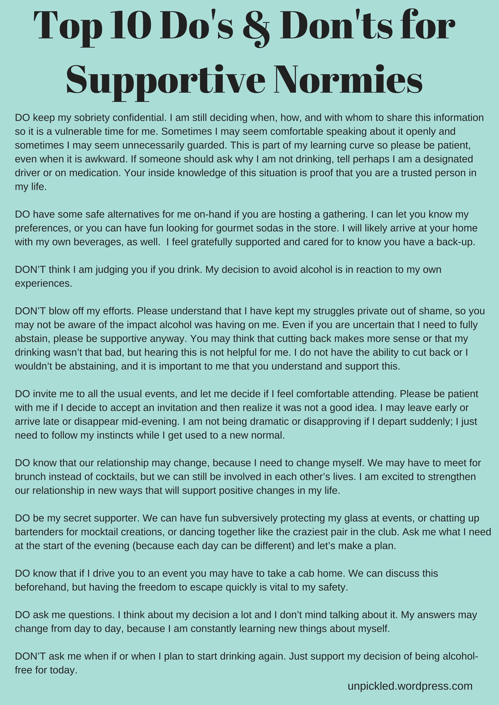 I’ve created a “Do’s and Don’ts” list that you can print for or email to your Supportive Normies. First though, think carefully about choosing your confidants. Your knee-jerk reaction may be to bee-line for the usual suspects (your sister, bestie, or spouse), but the best choices may be someone you spend less time with. If you are new to recovery, you may have surrounded yourself with drinking buddies and enablers. Certainly there could be true gems among this group, but also consider a favourite aunt, neighbour, or other person who has become peripheral in your life because they were not part of your drinking structure. Give this some quiet thought.