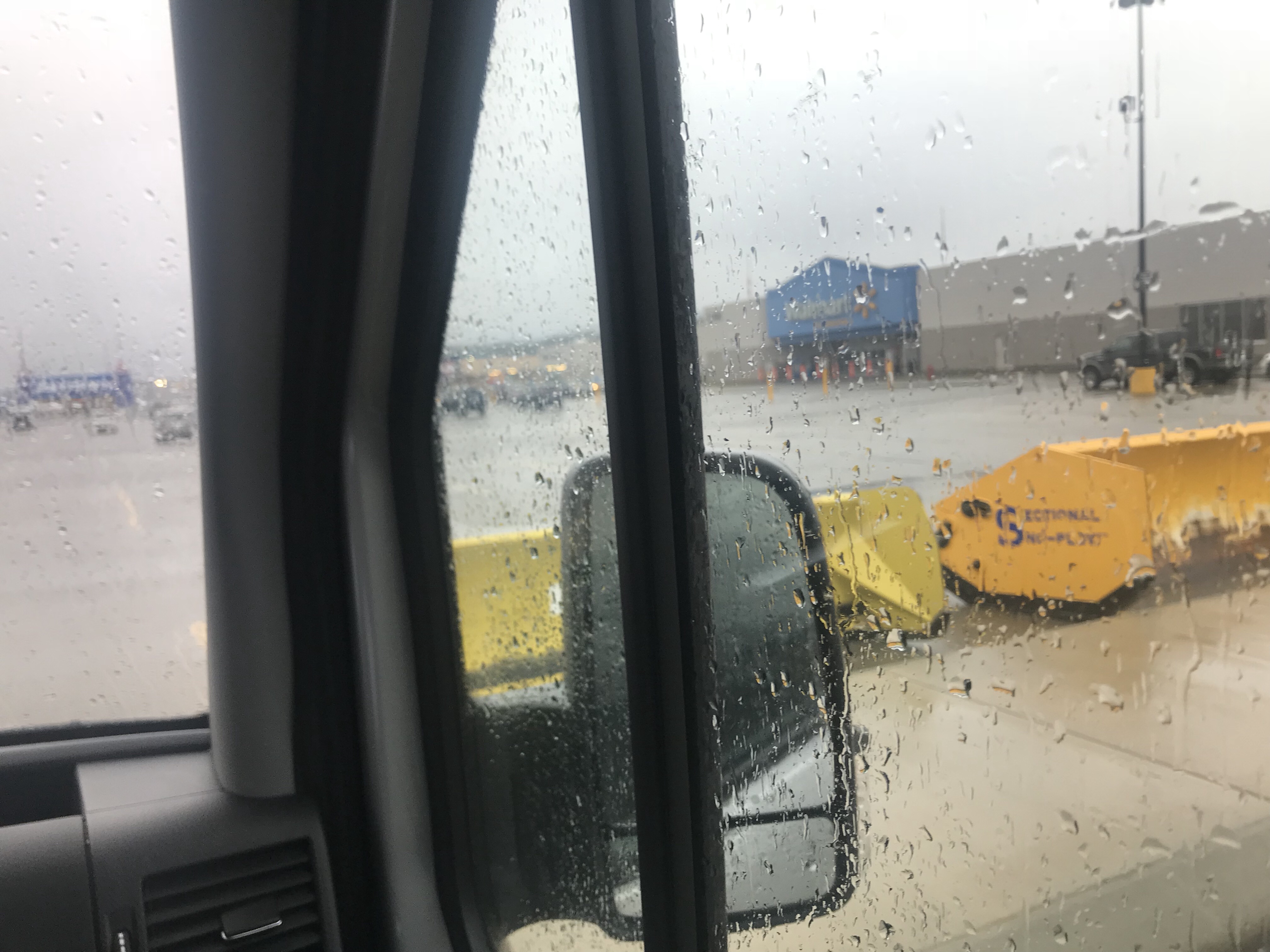 We drove to the forecasted edge of the storm, three hours west, and spent the night in a parking lot. Scenic.
